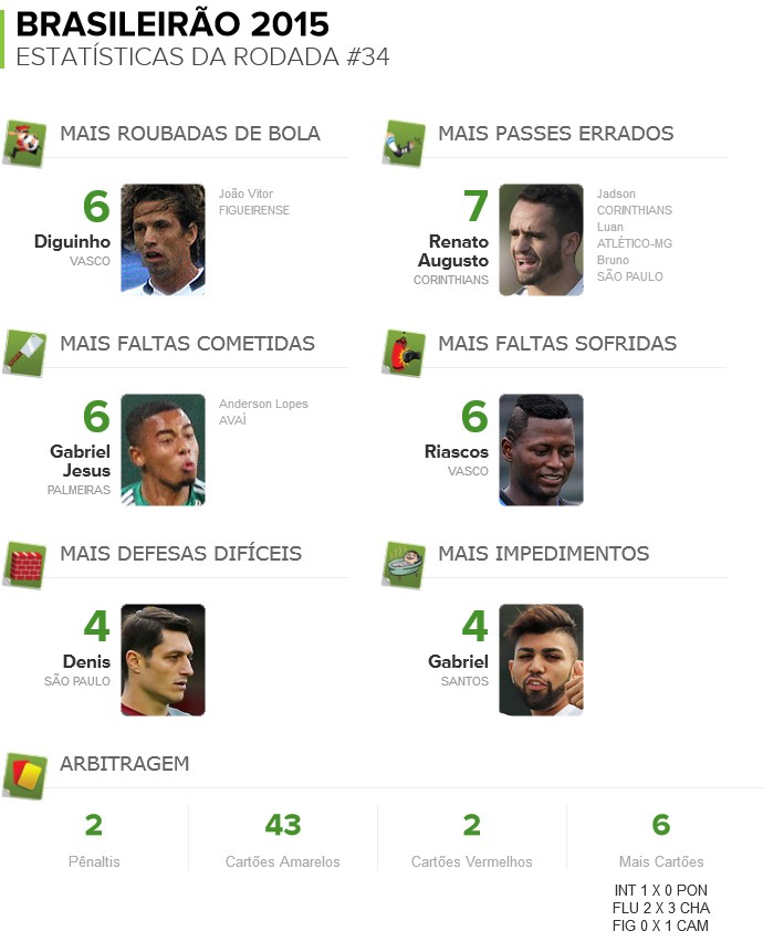 Outro que saiu do seu normal foi o palmeirense Gabriel Jesus. De caçado virou caçador e abusou das faltas na derrota em casa para o Vasco, por 2 a 0. O atacante cometeu seis infrações, mesmo número de outro jogador de frente na rodada: Anderson Lopes, do Avaí.