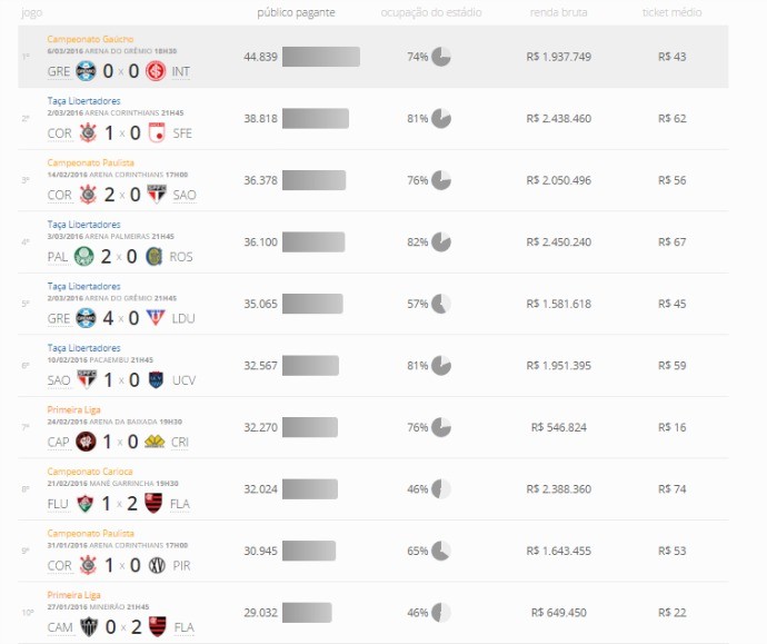e dentro de campo o clássico entre Grêmio e Internacional foi pouco inspirado e terminou com o placar em branco, na arquibancada da arena gremista as torcidas deram um show à parte. O Gre-Nal 409, válido pelo Campeonato Gaúcho e pela Primeira Liga, registrou 44.839 pagantes e bateu o recorde de público deste ano. Veja o público nos estádios do Brasil em 2016 envolvendo os 60 clubes das Séries A, B e C do Brasileirão.,