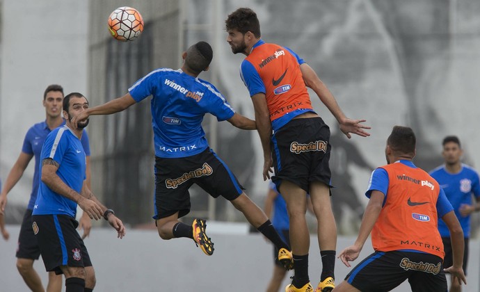 Felipe sobe de cabeça para tirar a bola durante treino do Timão (Foto: Daniel Augusto Jr. / Agência Corinthians)