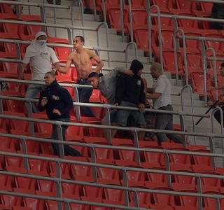 Soldado (sem camisa) durante briga no Mané Garrincha (Foto: Ed Ferreira / Agência Estado)