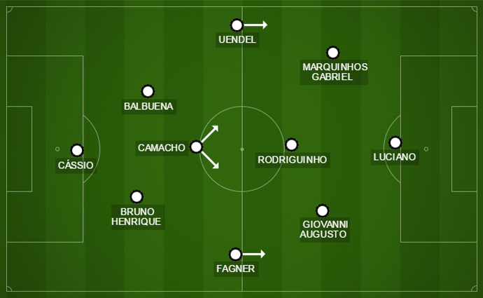 O Timão terminou mesmo o jogo com mais passes trocados do que o Fluminense: 337 contra 256 do adversário. Camacho atuou da maneira que estava acostumado no Audax – buscando a bola perto dos zagueiros e iniciando as jogadas. Liberados para atacar, Fagner e Uendel se juntaram aos quatro homens de frente e ensaiaram uma pressão.