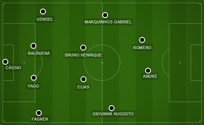 Fora do treino técnico deste sábado por dores nas costas, o meia deu lugar a Guilherme na equipe. O time contou com Cássio, Fagner, Yago, Balbuena e Uendel; Bruno Henrique e Elias; Romero, Guilherme e Giovanni Augusto; André.