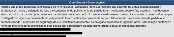 "Informo que antes da partida, na execução do Hino Nacional, torcedores do E.C. Corinthians que estavam na arquibancada utilizaram sinalizadores, onde o delegado do jogo e o comandante do policiamento na partida foram notificados sobre o fato ocorrido, não havendo atraso no início da partida. Já no reinício da partida, teve um atraso de 6 minutos em função do mesmo motivo citado acima. Convém informar que o delegado do jogo e o comandante do policiamento foram notificados novamente sobre o fato ocorrido. Após o término da partida, o Sr. Coronel Resende, supervisor da segurança do E.C. Corinthians, apresentou ao delegado da partida, Sr. Agnaldo Vieira, uma relação contendo o nome de três torcedores identificados pela polícia que participaram da ação acima citada."
