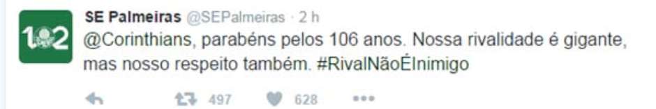 Destacando a grandiosidade da rivalidade entre as duas equipes, o perfil do Verdão no twitter lembrou do respeito que existe entre ambos, pregando contra uma associação que o fato de torcer para equipes rivais possa ter com a prática de violência.