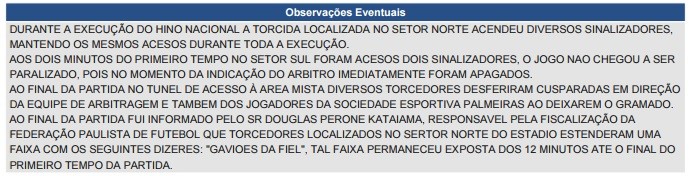 Por fim, o árbitro do clássico também relata a informação de um fiscal da FPF, que notou uma faixa proibida no estádio: "Ao final da partida fui informado pelo senhor Douglas Perone Kataiama, responsável pela fiscalização da Federação Paulista de Futebol, que torcedores localizados no setor norte estenderam uma faixa com os seguintes dizeres: "Gaviões da Fiel", tal faixa permaneceu exposta dos 12 minutos até o final do primeiro tempo da partida".