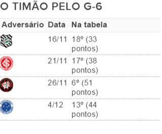 As quatro últimas rodadas do Campeonato Brasileiro não reservam notícias tão boas ao Corinthians. Se quiser reagir na competição e se garantir entre os seis primeiros colocados na tabela, que vão à Taça Libertadores de 2017, o Timão terá de superar um adversário direto pelo G-6, seu algoz na Copa do Brasil e duas equipes desesperadas na luta contra o rebaixamento.