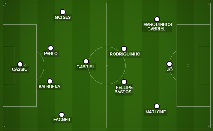 Escalação: Cássio, Fagner, Balbuena, Pablo e Moisés; Gabriel; Marlone, Fellipe Bastos, Rodriguinho e Marquinhos Gabriel; Jô