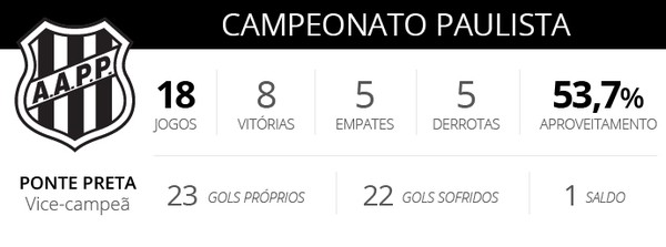 Após um começo de temporada morno, a Ponte Preta engrenou com a chegada de Gilson Kleina e por pouco não fez história no Paulistão. Eliminou o Santos nas quartas e o Palmeiras nas semifinais. Na decisão, porém, não resistiu ao Corinthians e viu seu primeiro grande título escapar mais uma vez. Destaque para William Pottker, que superou a crise com a transferência mal sucedida no início do ano para ser o artilheiro do campeonato.
