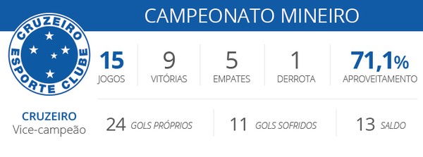 O Cruzeiro de Mano Menezes por pouco não terminou o Campeonato Mineiro invicto. Por pouco. Foram oito vitórias e três empates na 1ª fase, ficando atrás apenas do Atlético-MG no critério de desempate. E após passar pelo América nas semis, perdeu justamente a última partida da competição para o Galo e viu o rival ser campeão. Rafael Sóbis, o argentino Ábila e o meia Arrascaeta foram os destaques do time.