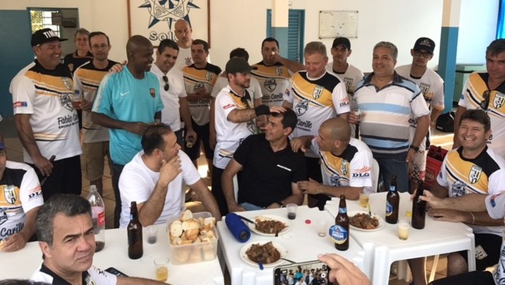 Carille e o pessoal do time dos veteranos no churrasco pós-jogo (Foto: Victor Pozella)