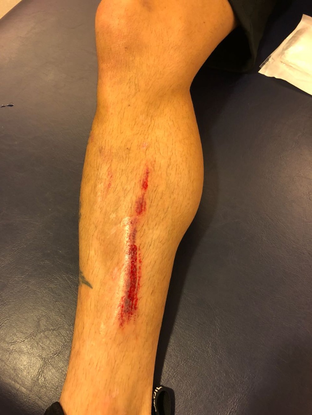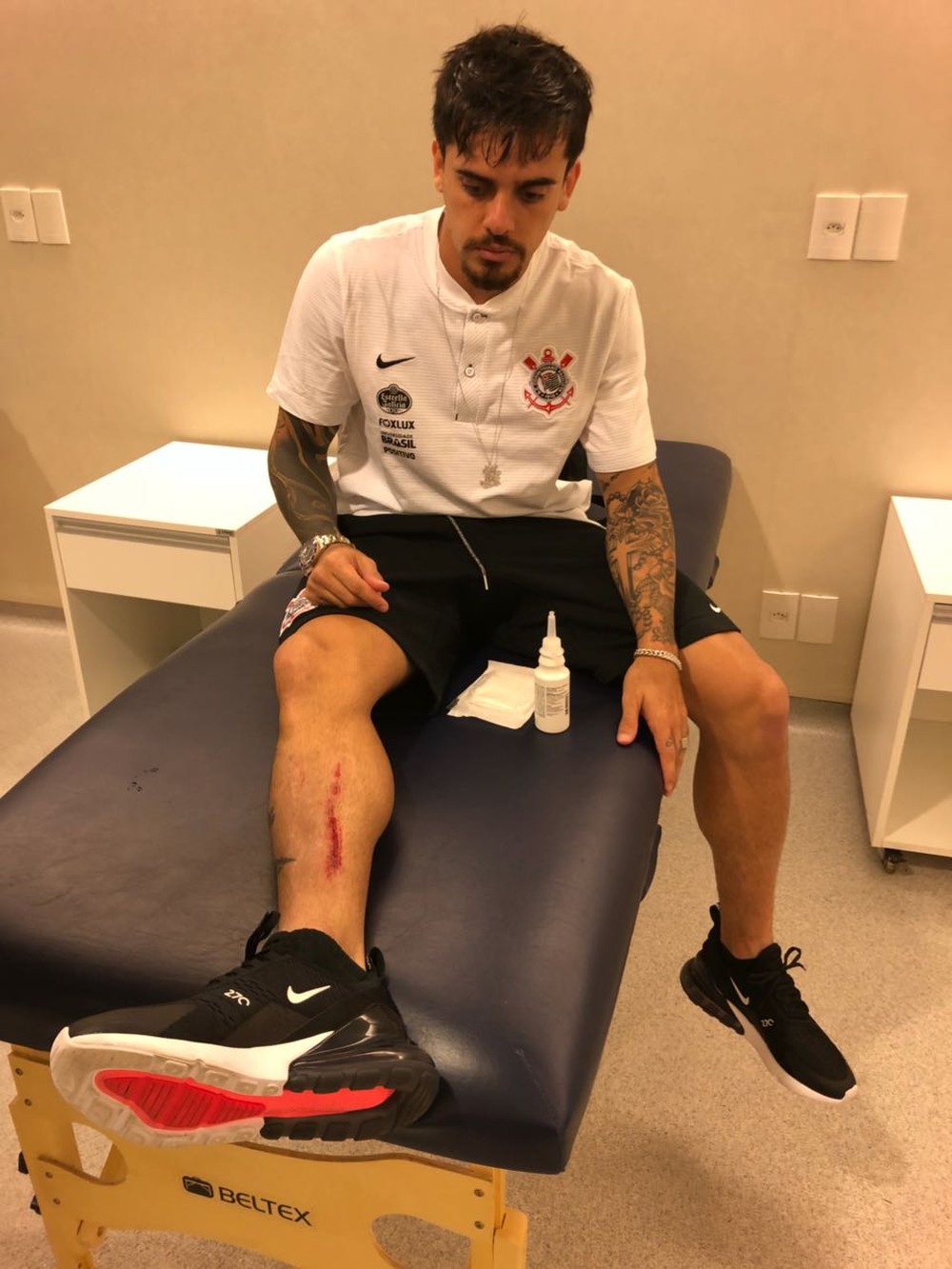 Detalhe da perna de Fagner no vestiário da Arena Corinthians (Foto: Arquivo pessoal)