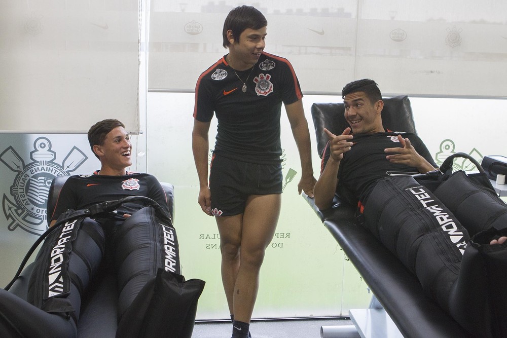 Além deste método, o Corinthians recorre a banheiras de gelo e botas de compressão pneumática, como as que podem ser vistas em Mateus Vital e Balbuena na foto abaixo: