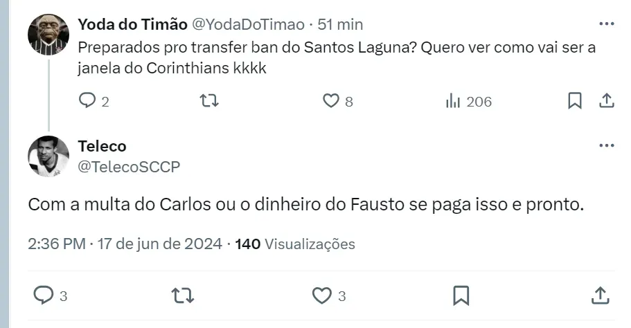 Timão vive dilema no mercado O Corinthians aparece perto da zona de rebaixamento do Brasileirão e o presidente Augusto Melo promete reforçar o time na janela de transferências de julho. Mas a falta de dinheiro em caixa, pode atrapalhar os planos do dirigente. © Marcello Zambrana/AGIF Félix Torres durante partida contra o Botafogo. Timão tem dívida com mexicanos. Em entrevista recente, o dirigente do Timão admitiu que o caixa do clube está vazio e, com isso, o Alvinegro deixou de fazer alguns pagamentos importantes e pode resultar em punição na Fifa. O Clube Paulist a atrasou a parcela da compra de Félix Torres e o prazo para fazer o pagamento era até esta segunda-feira (17). Segundo o jornalista Venê Casagrande, o Corinthians não quitou essa pendência financeira e o Santos Laguna, do México, vai acionar a Fifa. Mexicanos não vão facilitar Segundo o repórter do SBT, o time mexicano vai cobrar o valor total da venda, que foi concluída em janeiro deste ano. Ou seja, será exigido do Timão o pagamento integral, que está em 6,5 milhões de dólares (R$ 35 milhões na cotação atual). A parcela que o Alvinegro não pagou foi de R$ 6 milhões e venceu no dia 15 de maio. O Santos Laguna deu um prazo de um mês para o presidente Augusto Melo quitar e, mesmo assim, não foi pago. Félix Torres é titular no time de António Oliveira e está com a Seleção do Equador para a disputa da Copa América. O zagueiro assinou contrato até 2027 e 80% dos direitos econômicos do atleta pertencem ao Clube Paulista. Volante está de saída Em dificuldades financeiras, o presidente Augusto Melo está disposto a negociar jogadores e Fausto Vera não deve mais jogar no Alvinegro do Parque São Jorge. Atlético-MG e Boca Juniors são possíveis destinos. Outro jogador que não deve seguir no Corinthians é o goleiro Carlos Miguel. Inclusive, o clássico contra o São Paulo pode ter sido sua despedida no time corinthiano. O Nottingham Forest está decidido a pagar a multa do arqueiro. Torcedores opinam na web: