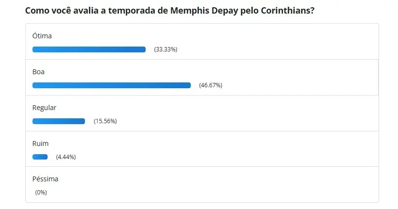 Entre os participantes da enquete, 46,67% consideraram o desempenho de Memphis como "bom", enquanto 33,33% o avaliaram como "ótimo". Apenas 15,56% dos torcedores o classificaram como "regular", e uma minúscula fração de 4,44% opinou que seu ano foi "ruim". Curiosamente, a opção "péssima" não recebeu nenhum voto, demonstrando o apreço da torcida pelo jogador.