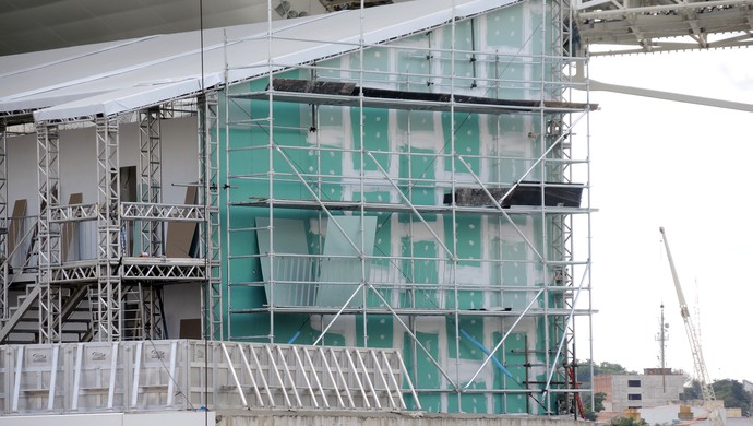 Um grupo de funcionários da Fifa passou a manhã desta quinta-feira pintando de branco uma estrutura que, originalmente, levava a cor verde, na Arena Corinthians. Localizado entre os setores Sul e Oeste do estádio, o local foi montado pela entidade para receber estúdios de TV de emissoras que farão a transmissão das partidas da Copa do Mundo. Ali, os comunicadores ficarão alojados em uma espécie de aquário, com visão para todo o estádio.