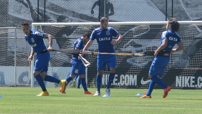 Os titulares do Corinthians foram a campo pela primeira vez desde o empate por 1 a 1 no clássico com o Palmeiras, no estádio do Pacaembu, no último sábado. Comandados pelo preparador físico Eduardo Silva, os jogadores trabalharam em campo reduzido, ainda com a presença do lateral-esquerdo Fábio Santos - ele está suspenso pelo terceiro cartão amarelo e não enfrenta o Coritiba no próximo sábado, às 21h (horário de Brasília), na Arena de Itaquera.