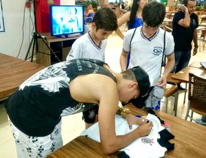 Os amigos corintianos Rafael Ramiro e Fábio Oliveira, ambos de 12 anos, foram alguns dos que conseguiram ter um autógrafo do corintiano.