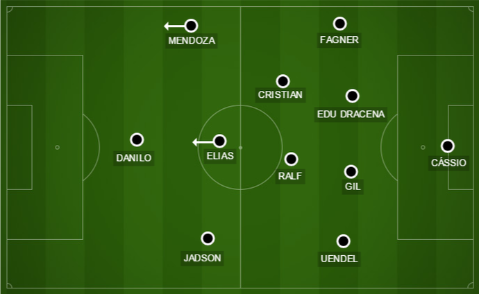A lesão de Renato Augusto acabou sendo boa para Tite, que pôde modificar a estrutura da equipe e encontrar uma solução para vencer o jogo. Cristian entrou no intervalo como um segundo volante para reforçar o trabalho de Ralf, alterando a formação do 4-1-4-1 para o 4-2-3-1. Elias virou um armador centralizado, tendo Jadson pela direita, e Mendoza, pela esquerda.