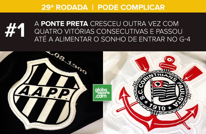 A tabela também ajuda o Corinthians a confiar que não deixará o título escapar pelas mãos. Quatro adversários brigam contra o rebaixamento (Goiás, Coritiba, Avaí e Vasco). Outros três estão no meio da tabela (Ponte Preta, Sport e Atlético-PR). Dois lutam para entrar no grupo que disputará a Libertadores (Flamengo e São Paulo) e só um (Atlético-MG) sonha com a taça.