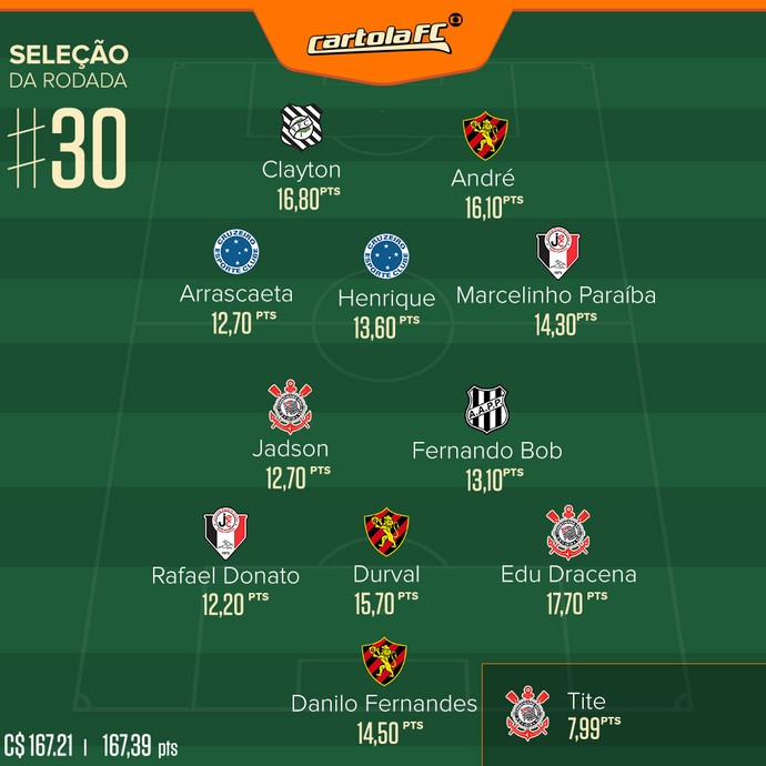 Líder isolado do Brasileirão, o Corinthians tem sido a principal aposta no Cartola FC quando joga em casa. Na rodada#30 não foi diferente. O Timão teve quatro jogadores (Jadson, Vagner Love, Renato Augusto e Gil) e mais o técnico entre os mais escalados no fantasy game. O preferido dos cartoleiros foi Jadson, que correspondeu ao investimento. Presente em mais de 561 mil times, o meia deu duas assistências, teve dois chutes defendidos e roubou duas bolas, anotando 12.70 pontos. Vagner Love (em mais de 459 mil equipes) também deu lucro com uma boa pontuação: 9.60.