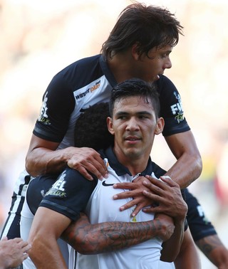 Balbuena é abraçado por Romero após fazer gol contra o Linense, no sábado (Foto: Agência Estado)