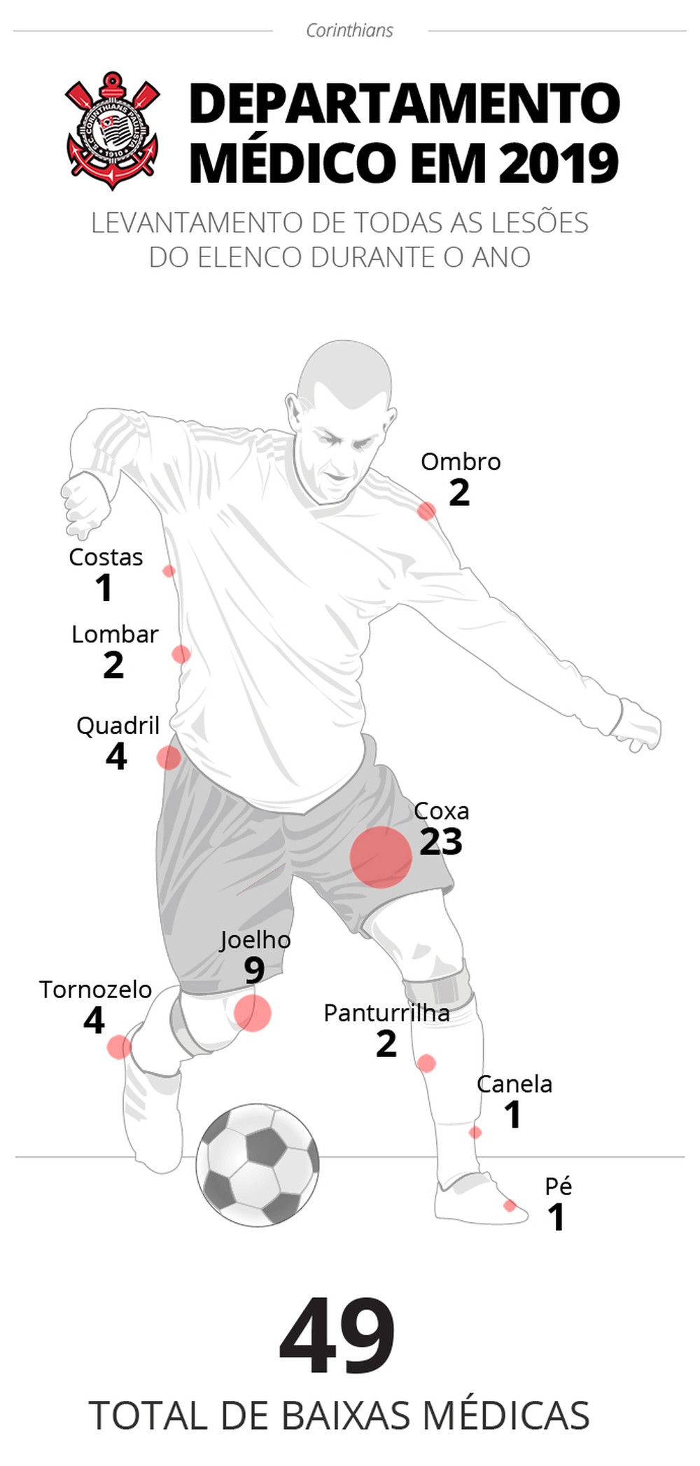 As 49 baixas por motivos médicos podem ajudar a explicar o irregular ano do Corinthians. A temporada começou bem com a conquista do Campeonato Paulista, mas o segundo semestre poderia ter sido melhor (semifinal da Sul-Americana e oitavo colocado do Brasileirão). O número de contusões é considerado alto em comparação com as outras equipes da Série A do Brasileirão. Para se ter ideia, a soma geral de complicações médicas supera 2016 (46), 2017(46) e 2018 (42).
