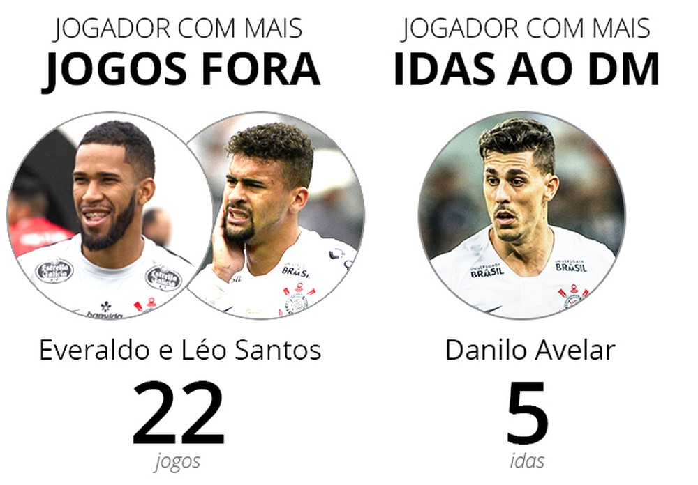 Em números gerais, os maiores desfalques foram Everaldo e Léo Santos. Cada jogador da dupla ficou impossibilitado de atuar em 22 partidas. O atacante teve uma pubalgia no fim de agosto e ficou fora dos jogos até o fim da temporada. Já o defensor foi emprestado ao Fluminense no início da temporada, teve que ser operado por decorrência de uma tendinite patelar no joelho direito e foi devolvido ao Timão. Em agosto, quando estava perto de voltar a atuar, o zagueiro sofreu outra fratura no mesmo lugar. Ele retornará apenas em 2020.