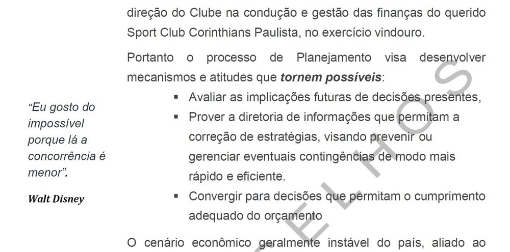 Fato curioso, porém irrelevante, é que o documento ao qual o blog teve acesso contém uma epígrafe de Walt Disney. Ao lado das medidas que a diretoria do Corinthians entende como necessárias para tornar os números orçados possíveis, há menção a uma frase atribuída ao criador do Mickey e da gigantesca companhia americana que leva seu nome. "Eu gosto do impossível porque lá a concorrência é menor".