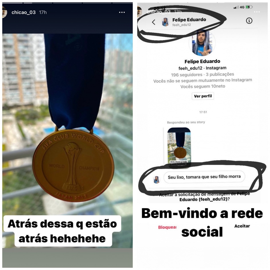 Após a derrota do rival, Chicão, assim como outros jogadores, foi às redes sociais e publicou uma foto da medalha conquistada por ele em 2012, no Japão, contra o Chelsea. "Atrás dessa que estão", escreveu o zagueiro na foto publicada na plataforma Stories do Instagram. Foi a partir desta foto que o torcedor rival afirmou "seu lixo, tomara que seu filho morra".