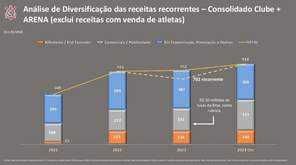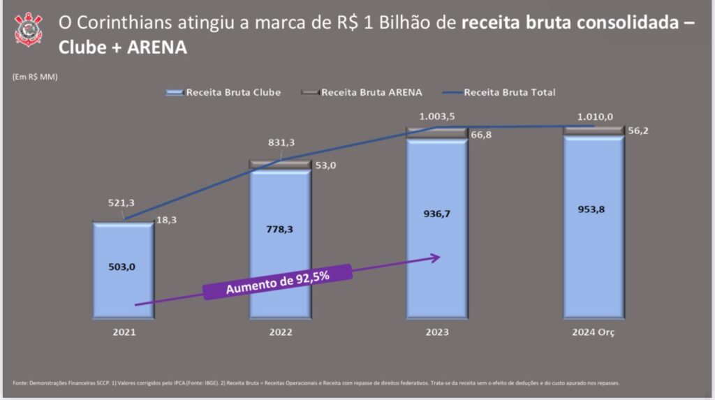 Entre as principais variações do balanço, foi destacado, por escrito, a receita com a Brax, empresa de placas de publicidade da Neo Química Arena. O texto confirma o recebimento de R$ 2,5 milhões em luvas ainda em 2023 e também a garantia do pagamento de mais R$ 47,5 milhões para 2024, receita que ficou para o mandato de Augusto Melo. (Foto: Reprodução)