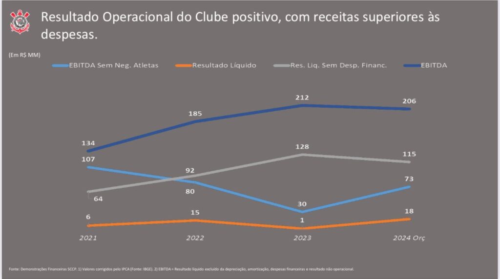 O resultado operacional consolidado (Ebitda) também foi positivo: R$ 259 milhões. Esse montante se refere à geração de caixa, ele abrange tudo o que o clube arrecadou e subtrai deste valor tudo o que o clube gastou, sem despesa de juros e amortizações. O triênio da gestão anterior, portanto, obteve um lucro operacional total de R$ 608 milhões, valor que não fica no caixa justamente porque é destinado a pagamentos de dívidas, juros, amortizações, entre outros compromissos. (Foto: Reprodução)