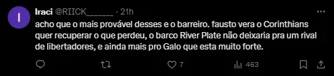 Uma possível condição seria o Galo se dispor a negociar ou assumir uma dívida que o Corinthians tem com o Argentinos Juniors, acrescida de juros. Neste cenário, o Atlético-MG também poderia oferecer uma quantia em dinheiro ao Corinthians pelo jogador Fausto Vera, que tem contrato com o clube paulista até o final de 2026 e um valor de mercado de cerca de R$ 31 milhões.