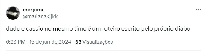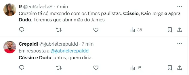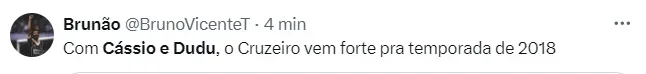 Comentários nas redes sociais “Dudu e Cássio no mesmo time é um roteiro escrito pelo próprio diabo”, comentou um dos torcedores na internet. Um outro escreveu: “Cássio e Dudu no mesmo time, que doidera”. Já um outro torcedor do Bando de Loucos pontuou: “Com Cássio e Dudu, o Cruzeiro vem forte para 2018”. Já um outro integrante da Fiel torcida deixou sua opinião: “Cássio e Dudu juntos, quem diria”. De acordo com Jorge Nicola, o Cruzeiro desembolsará mais de R$ 16 milhões pela contratação de Dudu, parcelado ao longo de três anos. Lembrando que o acordo ainda não foi firmado entre as partes.