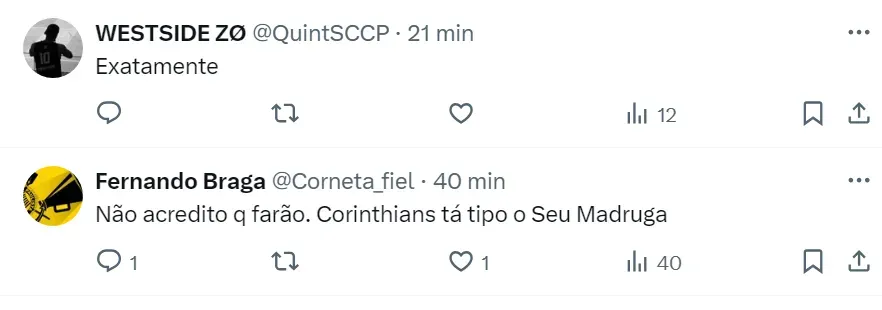 Timão vive dilema no mercado O Corinthians aparece perto da zona de rebaixamento do Brasileirão e o presidente Augusto Melo promete reforçar o time na janela de transferências de julho. Mas a falta de dinheiro em caixa, pode atrapalhar os planos do dirigente. © Marcello Zambrana/AGIF Félix Torres durante partida contra o Botafogo. Timão tem dívida com mexicanos. Em entrevista recente, o dirigente do Timão admitiu que o caixa do clube está vazio e, com isso, o Alvinegro deixou de fazer alguns pagamentos importantes e pode resultar em punição na Fifa. O Clube Paulist a atrasou a parcela da compra de Félix Torres e o prazo para fazer o pagamento era até esta segunda-feira (17). Segundo o jornalista Venê Casagrande, o Corinthians não quitou essa pendência financeira e o Santos Laguna, do México, vai acionar a Fifa. Mexicanos não vão facilitar Segundo o repórter do SBT, o time mexicano vai cobrar o valor total da venda, que foi concluída em janeiro deste ano. Ou seja, será exigido do Timão o pagamento integral, que está em 6,5 milhões de dólares (R$ 35 milhões na cotação atual). A parcela que o Alvinegro não pagou foi de R$ 6 milhões e venceu no dia 15 de maio. O Santos Laguna deu um prazo de um mês para o presidente Augusto Melo quitar e, mesmo assim, não foi pago. Félix Torres é titular no time de António Oliveira e está com a Seleção do Equador para a disputa da Copa América. O zagueiro assinou contrato até 2027 e 80% dos direitos econômicos do atleta pertencem ao Clube Paulista. Volante está de saída Em dificuldades financeiras, o presidente Augusto Melo está disposto a negociar jogadores e Fausto Vera não deve mais jogar no Alvinegro do Parque São Jorge. Atlético-MG e Boca Juniors são possíveis destinos. Outro jogador que não deve seguir no Corinthians é o goleiro Carlos Miguel. Inclusive, o clássico contra o São Paulo pode ter sido sua despedida no time corinthiano. O Nottingham Forest está decidido a pagar a multa do arqueiro. Torcedores opinam na web: