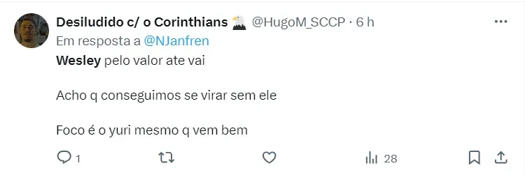 O garoto foi negociado por 23 milhões de euros, próximo de R$ 133 milhões, para o West Ham, que aparecia como um dos interessados na contratação de Wesley. Entretanto, o Corinthians buscava valorizar o jogador para conseguir o máximo possível. Já que a gestão entendia que as oscilações poderiam ser vistas como normais. Mas já são cinco partidas sem gol ou assistência. O UOL ainda revelou que após o gol marcado contra o Fluminense, em 28 de abril, apareceram vários interessados, mas agora a situação mudou. “Todos ligavam depois do golaço, agora não está mais assim”, esclareceu a fonte do UOL. Mas, apesar de ter esfriado, o jogador ainda pode ser negociado. O Corinthians não quer diminuir o valor, já que acredita que ele pode voltar a realizar atuações contundentes e garantir os 30 milhões de euros ao clube. Veja o que dizem os torcedores