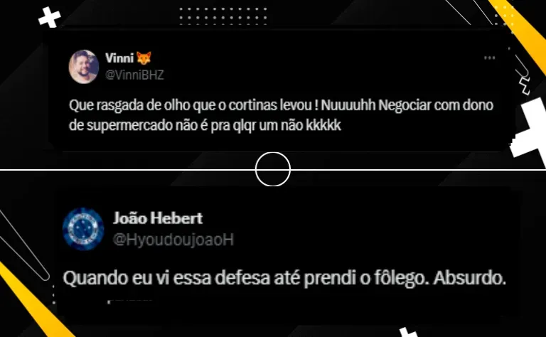 Agradecimento em tom irônico Se por um lado o técnico do Botafogo se manifestou, por outro os adeptos cruzeirenses não deixaram passar a grande atuação de seu camisa 1 e relembraram a saída dele do Clube Paulista. Pelo X, antigo Twitter, houve quem deixou o seu muito obrigado ao Alvinegro Paulista por ter liberado o goleiro a ir jogar em Belo Horizonte pela Raposa: “Obrigado, Corinthians, por ter liberado o Cássio de graça!”, disse um. Outro cruzeirense seguiu a linha e continuou a provocar os paulistas: “Diz a lenda que os corinthianos choram até hoje”, afirmou. Teve ainda quem completou: “De graça ainda”, frisou.