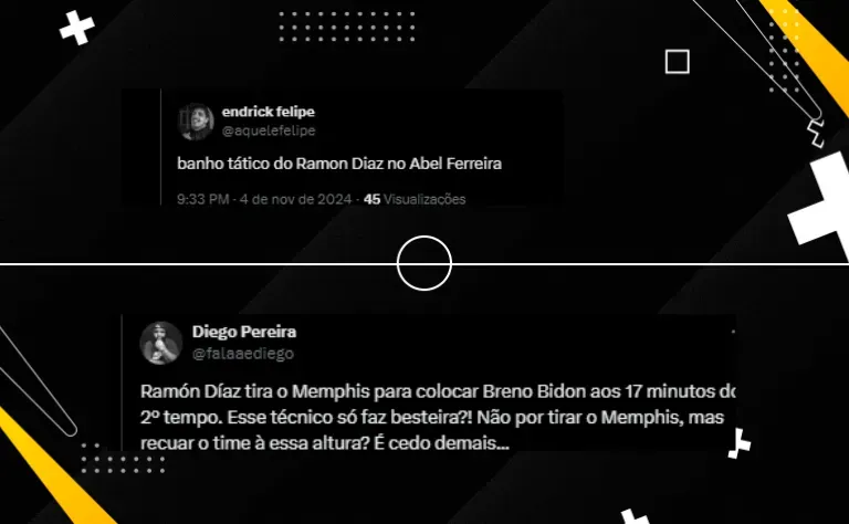“Ramón Díaz pode ficar, eu te perdoo”. “Banho tático do Ramon Diaz no Abel Ferreira”, elogiaram internautas sobre o desempenho do treinador em um clássico contra um adversário tão difícil. Treinador também foi criticado por decisão no clássico? Apesar dos elogios, ele também recebeu algumas críticas da Fiel pelo que fez durante o jogo. As críticas foram pelo fato das mexidas que o técnico fez durante o jogo. Muitas críticas se deram pelo fato de que ele recuou o time muito cedo no clássico e chamou o Palmeiras para cima.