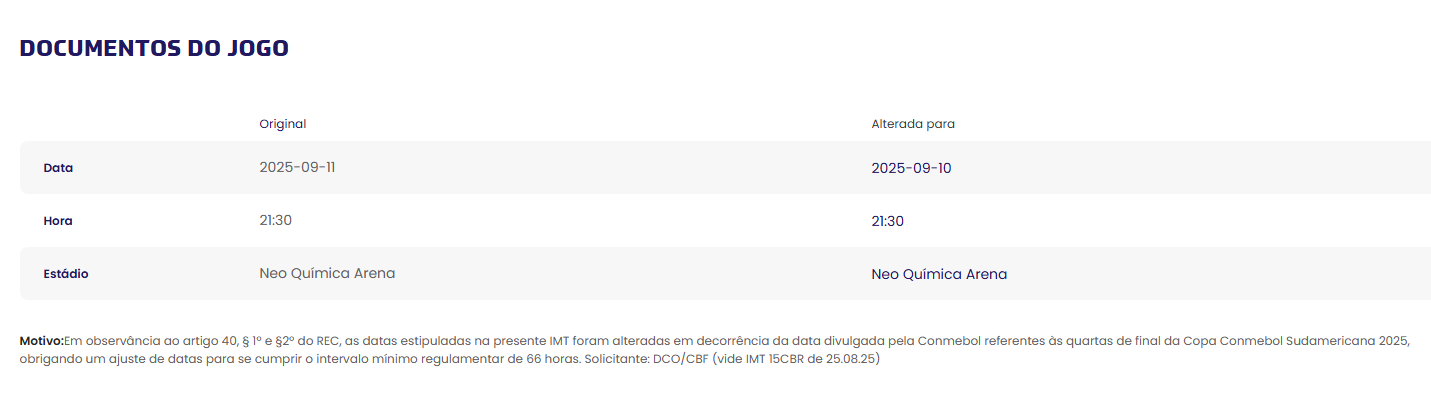 De acordo com a CBF, a mudança foi feita em respeito ao artigo 40, § 1º e § 2º do Regulamento Específico da Competição (REC). A confederação explicou que a alteração foi motivada pela data definida pela Conmebol para as quartas de final da Copa Conmebol Sudamericana 2025, o que forçou a adaptação dos cronogramas para garantir o intervalo mínimo regulamentar de 66 horas entre os jogos.