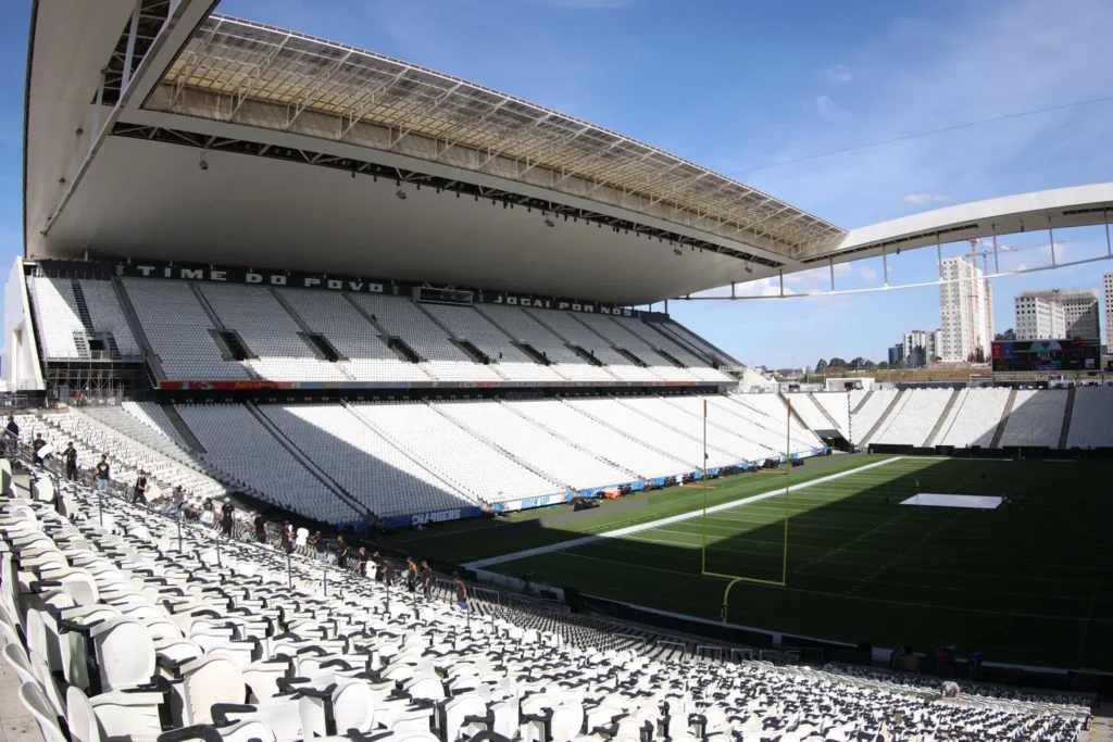A Neo Química Arena, que sediará o jogo da NFL no Brasil pelo segundo ano consecutivo, está passando por transformações. Os preparativos para o evento começaram logo após o apito final do clássico entre Corinthians e Palmeiras no último domingo, pelo Campeonato Brasileiro.