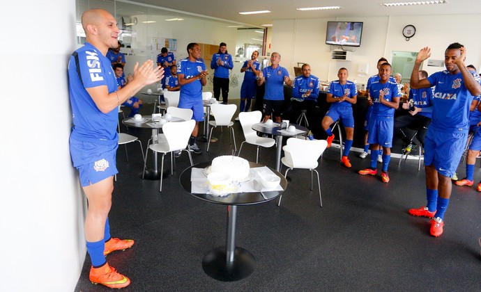No dia em que completou 29 anos, Fábio Santos foi a grande atração no treino do Corinthians, no CT Joaquim Grava. Antes da atividade, o lateral-esquerdo ganhou um bolo dos funcionários do clube e, empolgado, se lambuzou todo na hora de posar para fotos.
