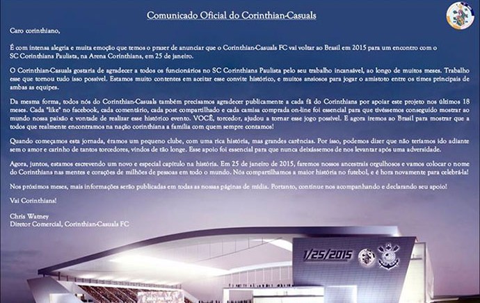 Chris Watney, representante do Casuals, assinou carta em português para agradecer ao Timão pelo convite. Um trecho diz que “estamos muito contentes em aceitar este convite histórico, e muito ansiosos para jogar o amistoso entre os times principais de ambas as equipes”.