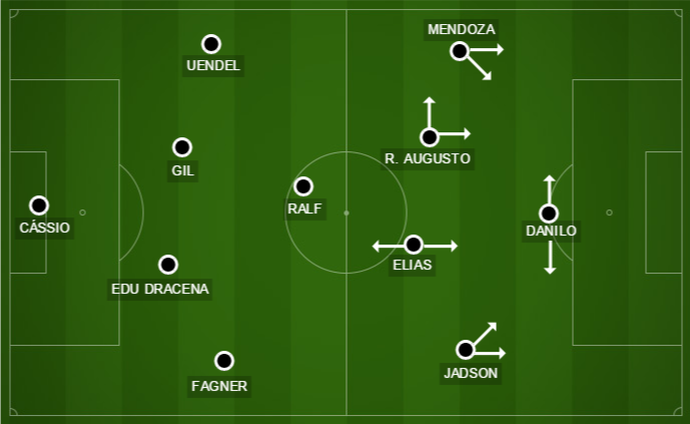 O Corinthians começa a partida com a seguinte formação: Cássio, Fagner, Edu Dracena, Gil e Uendel; Ralf; Elias, Jadson, Renato Augusto e Mendoza; Danilo.
